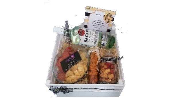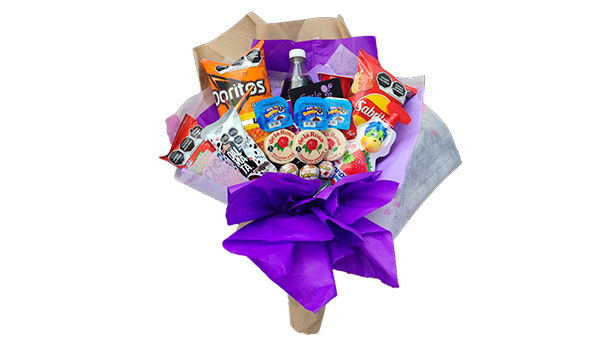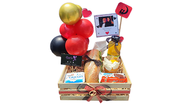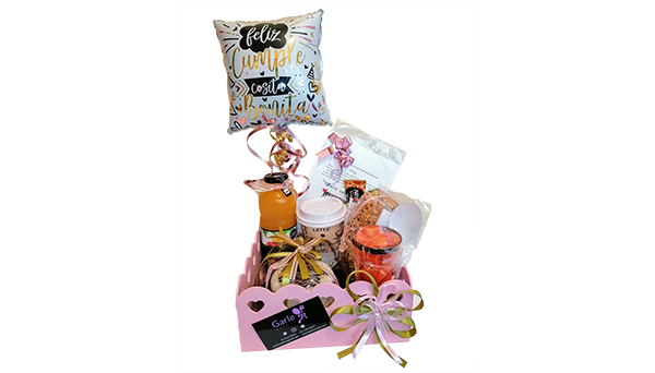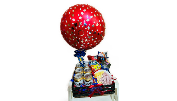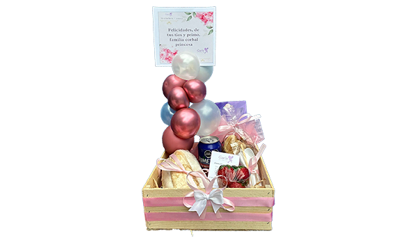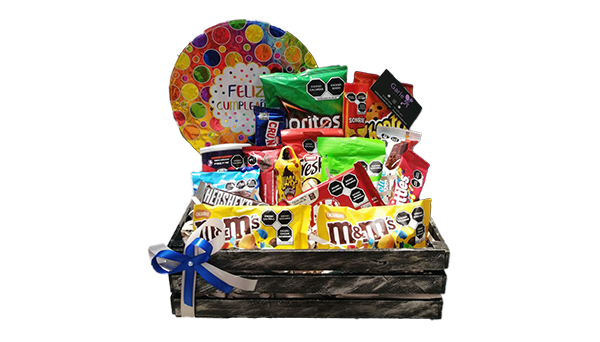 + Queso, vegetales, 1 Mini Pastel marca “La Esperanza”, Pingüinos, tarro de vidrio con jugo, chiles, 1 manzana, 1 bolsa de Sabritas, agua caliente, 1 sobre para preparar café capuchino, 2 tes, 2 endulzantes, 1 Hershey`s, yogurt estilo griego, 12 globos, tarjeta personalizada.