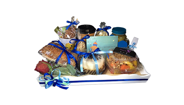 + 1 chapata con jamón de pechuga de pavo, queso y vegetales, taza (personalizada) o Termo, jugo en tarro de vidrio, fruta picada, agua caliente, sobre de café capuchino, 2 sobres de té, endulzantes, galletas, palomitas, cacahuates, chiles, flores (6), tarjeta personalizada.