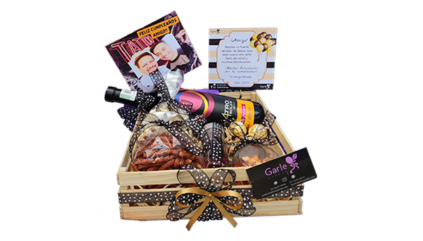 + Churritos con chipotle, mix de cacahuates salados o japonés; y enchilados, arándanos, 2 ferreros, tarjeta personalizada, foto impresa.