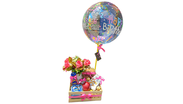 Astromelias, 1 mini pastel, globo 18” y dos globos 9” y tarjeta personalizada. Todo en base de madera reutilizable y decorada según la ocasión.