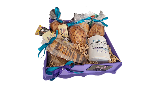 + Café americano, galletas, 2 endulzantes, fresas, 4 globos, tarjeta personalizada.