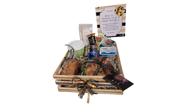 + Queso, vegetales, 1 Mini Pastel marca “La Esperanza”, Pingüinos, tarro de vidrio con jugo, chiles, 1 manzana, 1 bolsa de Sabritas, agua caliente, 1 sobre para preparar café capuchino, 2 tes, 2 endulzantes, 1 Hershey`s, yogurt estilo griego, 12 globos, tarjeta personalizada.